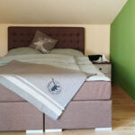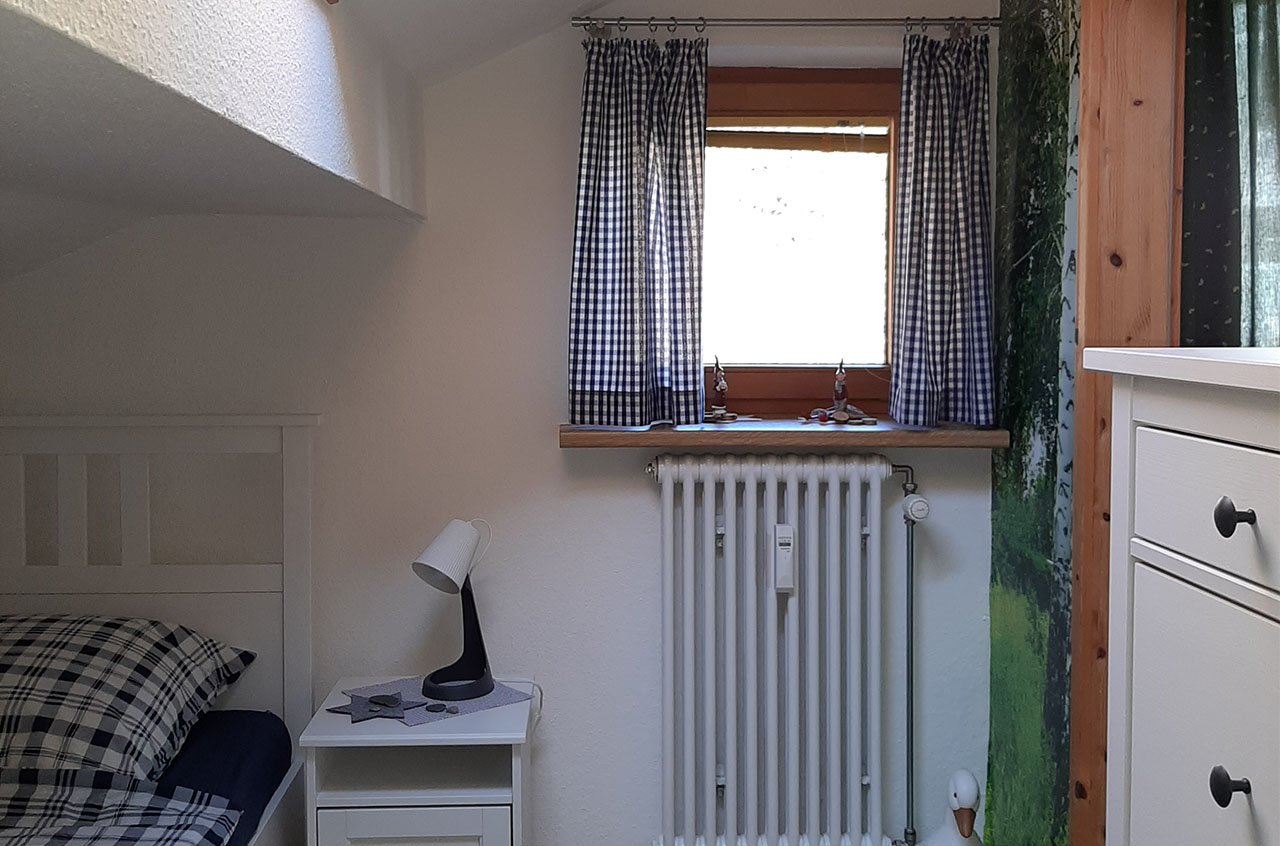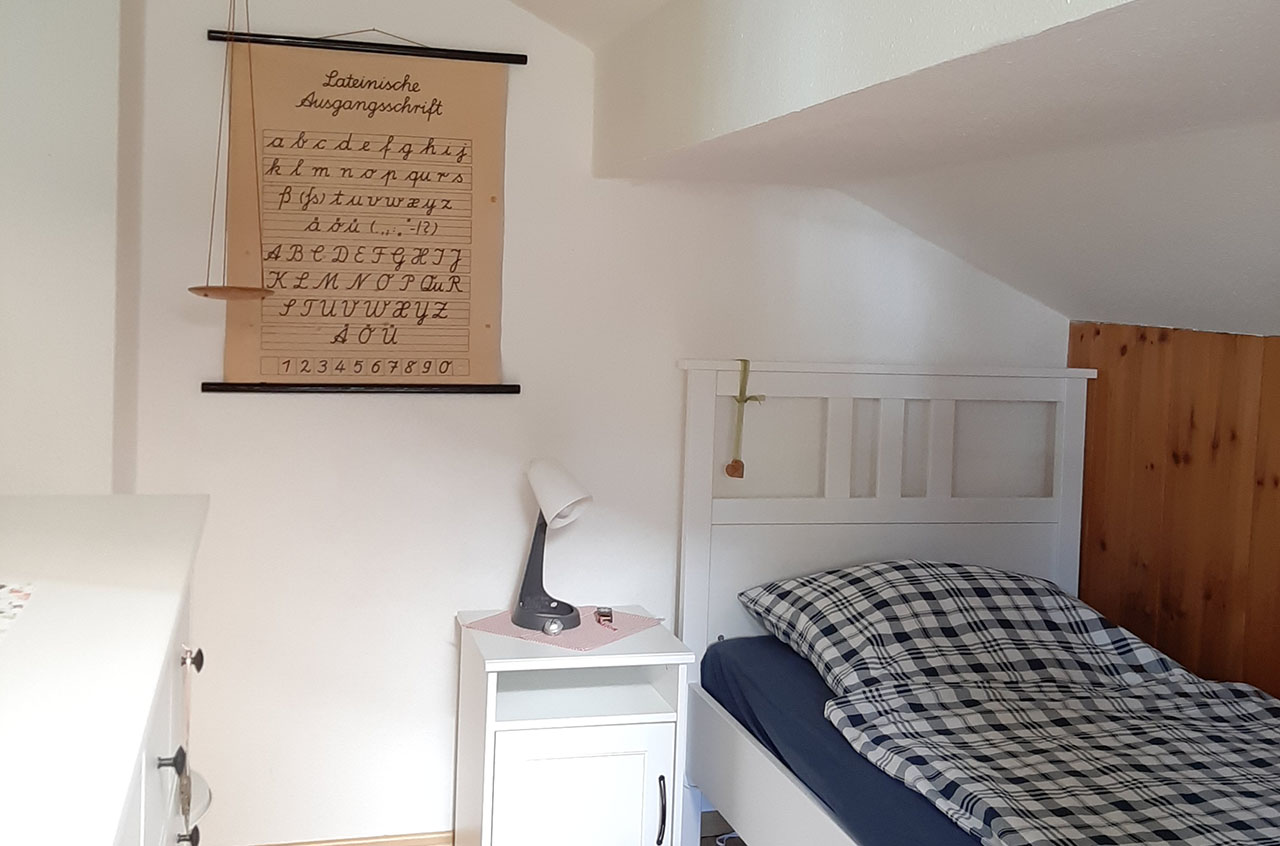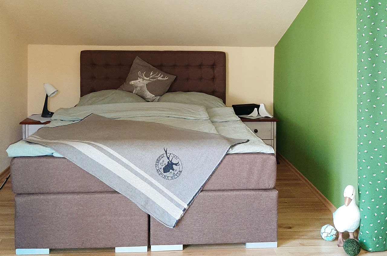 Vom Wohnzimmer geht es in das gemütliche Schlafzimmer (ca. 10 qm). Dieses ist mit zwei Betten und einer Kommode ausgestattet.